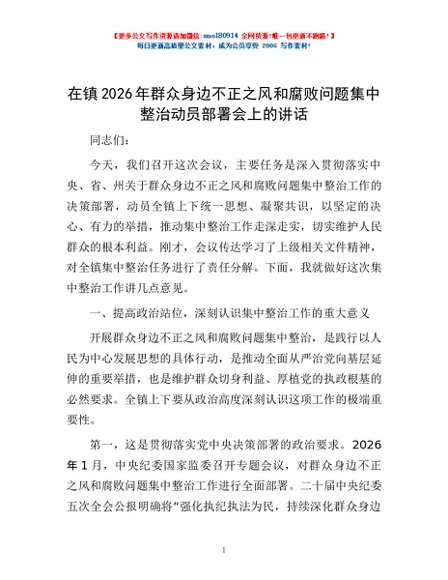 / 在镇2026年群众身边不正之风和腐败问题集中整治动员部署会上的讲话