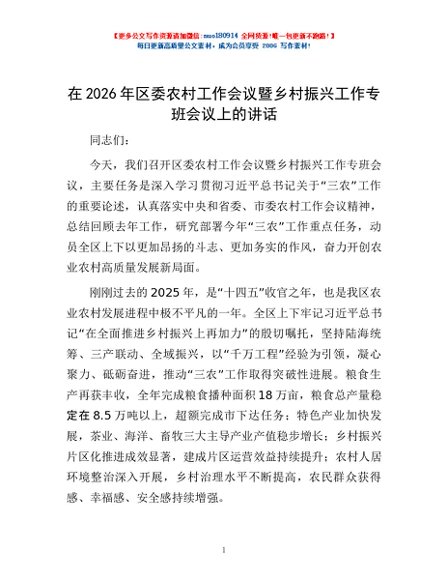/ 在2026年区委农村工作会议暨乡村振兴工作专班会议上的讲话