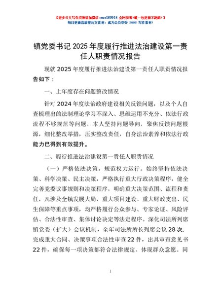 / 镇党委书记2025年度履行推进法治建设第一责任人职责情况报告