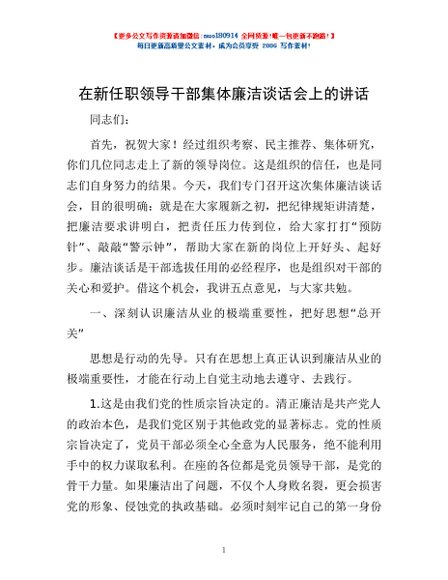 / 在新任职领导干部集体廉洁谈话会上的讲话