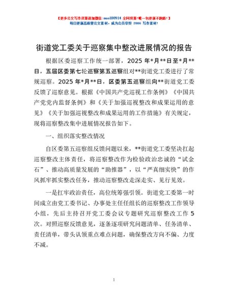 / 街道党工委关于巡察集中整改进展情况的报告