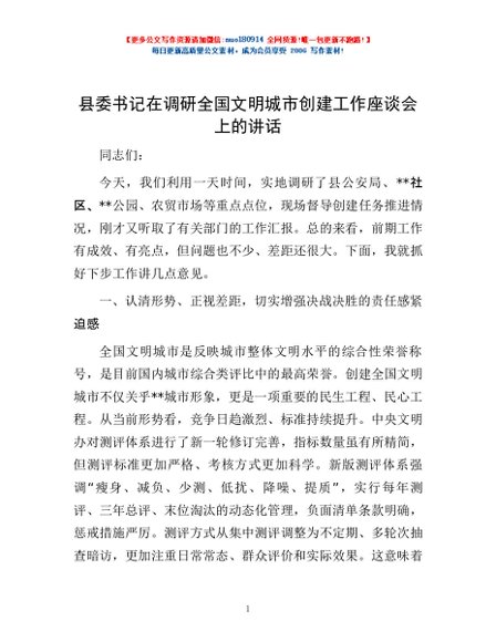 / 县委书记在调研全国文明城市创建工作座谈会上的讲话