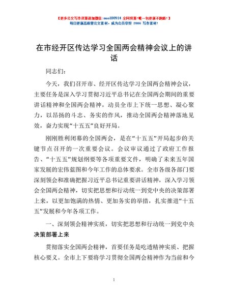 / 在市经开区传达学习全国两会精神会议上的讲话