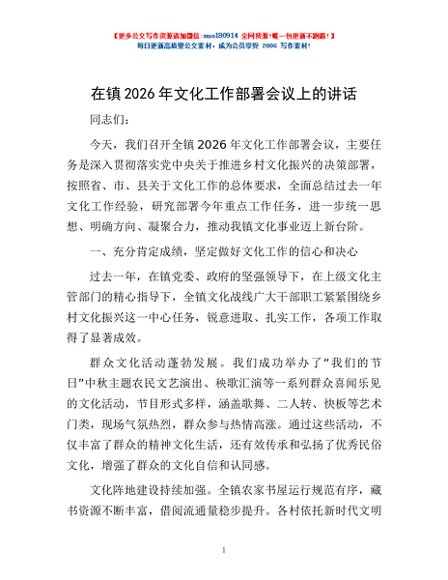 / 在镇2026年文化工作部署会议上的讲话