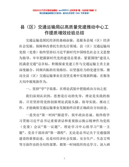 / 县(区)交通运输局以高质量党建推动中心工作提质增效经验总结