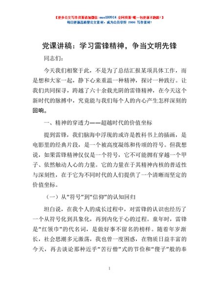 / 党课讲稿:学习雷锋精神,争当文明先锋