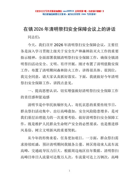 / 在镇2026年清明祭扫安全保障会议上的讲话