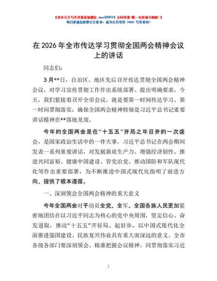 / 在2026年全市传达学习贯彻全国两会精神会议上的讲话