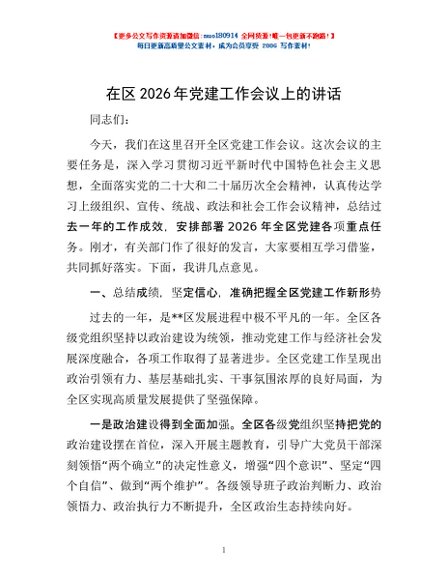 / 在区2026年党建工作会议上的讲话