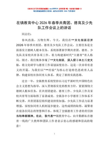 / 在镇教育中心2026年春季共青团、德育及少先队工作会议上的讲话