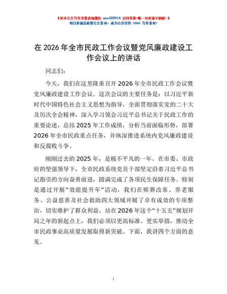 / 在2026年全市民政工作会议暨党风廉政建设工作会议上的讲话