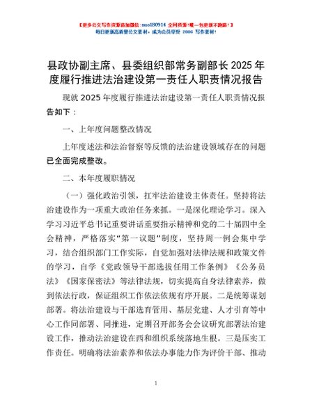 / 县政协副主席、县委组织部常务副部长2025年度履行推进法治建设第一责任人职责情况报告