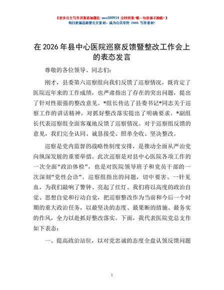 / 在2026年县中心医院巡察反馈暨整改工作会上的表态发言