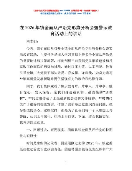 / 在2026年镇全面从严治党形势分析会暨警示教育活动上的讲话