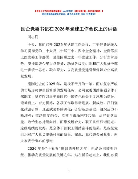 / 国企党委书记在2026年党建工作会议上的讲话