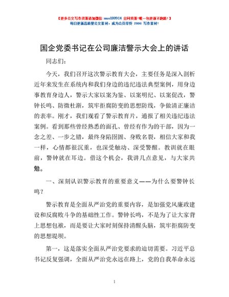 / 国企党委书记在公司廉洁警示大会上的讲话