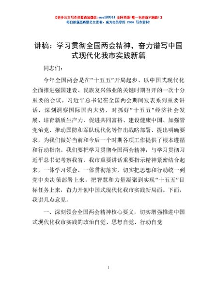 / 讲稿:学习贯彻全国两会精神,奋力谱写中国式现代化我市实践新篇