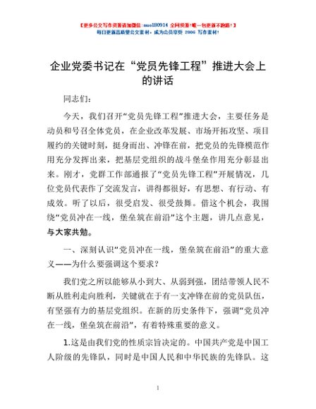 / 企业党委书记在“党员先锋工程”推进大会上的讲话