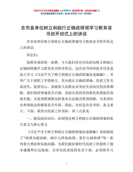 / 在市直单位树立和践行正确政绩观学习教育读书班开班式上的讲话