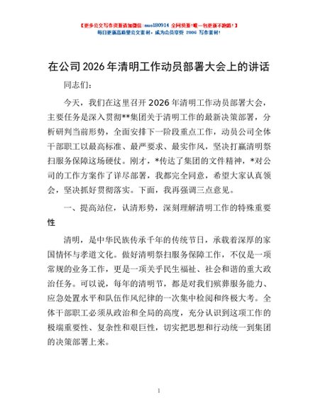 / 在公司2026年清明工作动员部署大会上的讲话