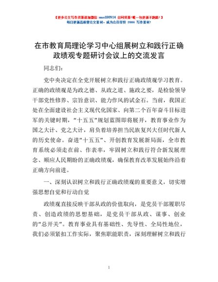 / 在市教育局理论学习中心组展树立和践行正确政绩观专题研讨会议上的交流发言