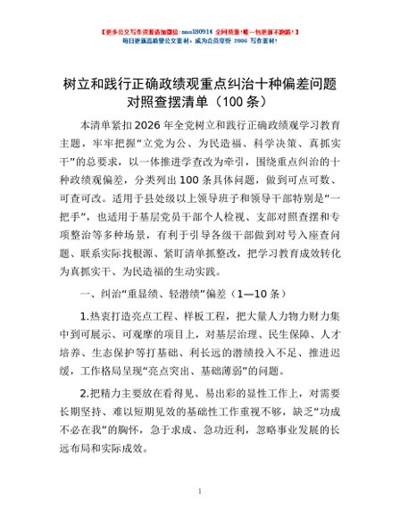 / 树立和践行正确政绩观重点纠治十种偏差问题对照查摆清单(100条)