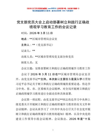 / 党支部党员大会上启动部署树立和践行正确政绩观学习教育工作的会议记录