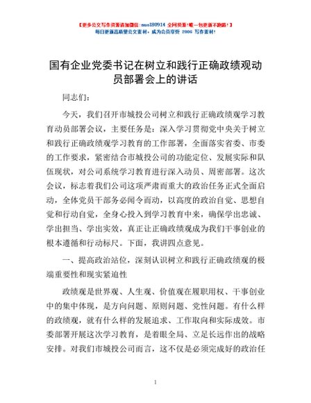 / 国有企业党委书记在树立和践行正确政绩观动员部署会上的讲话