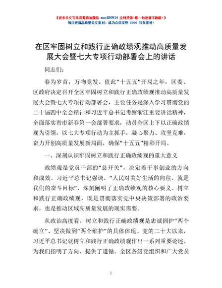 / 在区牢固树立和践行正确政绩观推动高质量发展大会暨七大专项行动部署会上的讲话