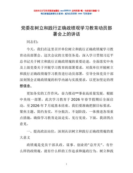/ 党委在树立和践行正确政绩观学习教育动员部署会上的讲话