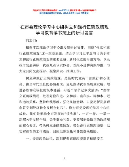 / 在市委理论学习中心组树立和践行正确政绩观学习教育读书班上的研讨发言