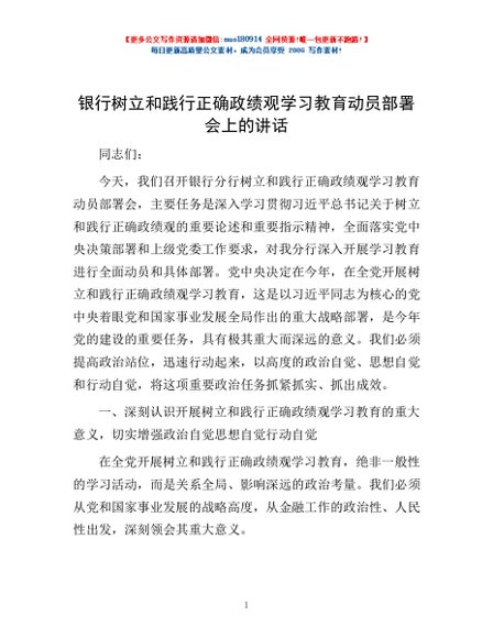 / 银行树立和践行正确政绩观学习教育动员部署会上的讲话