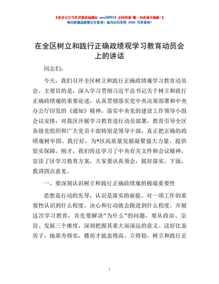 / 在全区树立和践行正确政绩观学习教育动员会上的讲话
