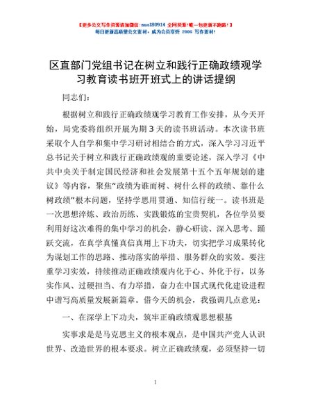 / 区直部门党组书记在树立和践行正确政绩观学习教育读书班开班式上的讲话提纲
