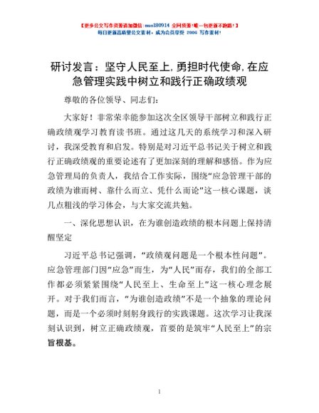 研讨发言:坚守人民至上,勇担时代使命,在应急管理实践中树立和践行正确政绩观