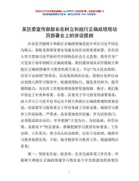 / 某区委宣传部部长在树立和践行正确政绩观动员部署会上的讲话提纲