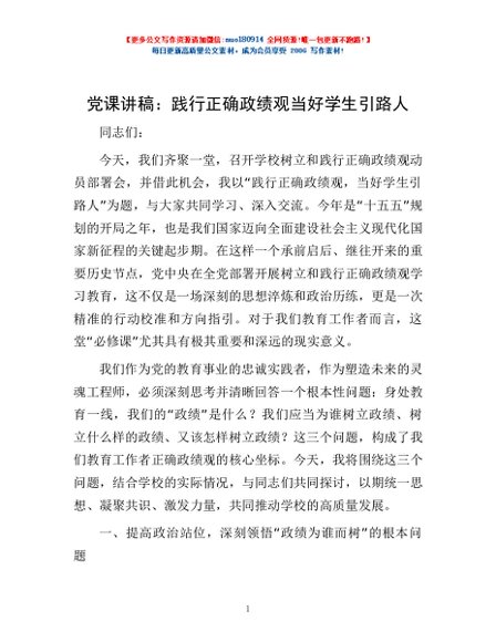/ 党课讲稿:践行正确政绩观 当好学生引路人