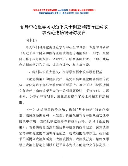 / 领导中心组学习习近平关于树立和践行正确政绩观论述摘编研讨发言