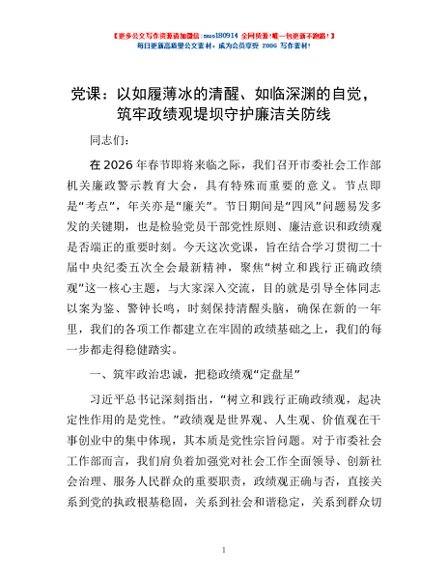 / 党课:以如履薄冰的清醒、如临深渊的自觉,筑牢政绩观堤坝守护廉洁关防线