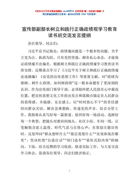 / 宣传部副部长树立和践行正确政绩观学习教育读书班交流发言提纲