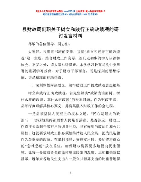 / 县财政局副职关于树立和践行正确政绩观的研讨发言材料