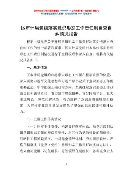 / 区审计局党组落实意识形态工作责任制自查自纠情况报告
