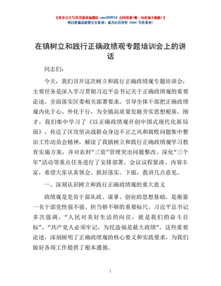 / 在镇树立和践行正确政绩观专题培训会上的讲话