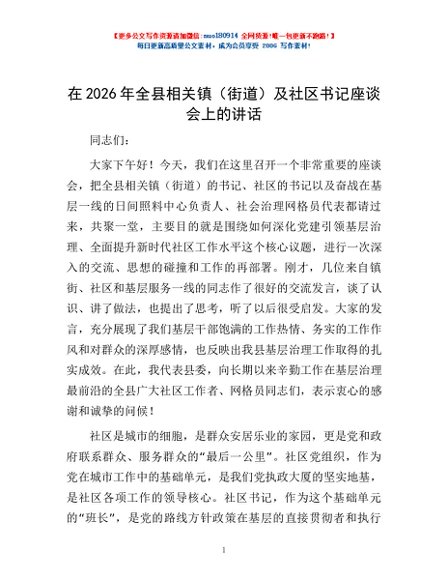 / 在2026年全县相关镇(街道)及社区书记座谈会上的讲话