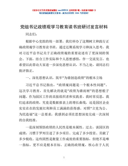/ 党组书记政绩观学习教育读书班研讨发言材料