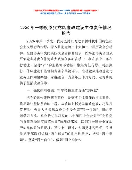 / 2026年一季度落实党风廉政建设主体责任情况报告