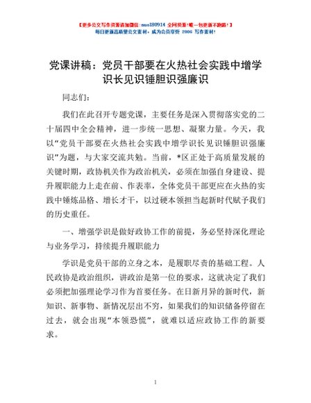 / 党课讲稿:党员干部要在火热社会实践中增学识长见识锤胆识强廉识