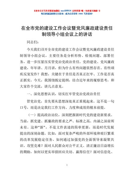 / 在全市党的建设工作会议暨党风廉政建设责任制领导小组会议上的讲话