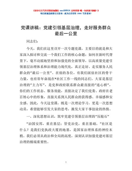 / 党课讲稿:党建引领基层治理,走好服务群众最后一公里