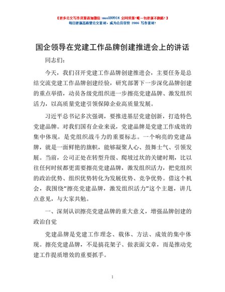 / 国企领导在党建工作品牌创建推进会上的讲话
